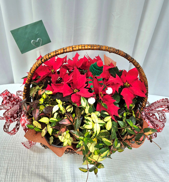 포인세티아의 붉은색. 덕분에 꽃보다 더 화려하고 멋진 축하바구니가 되었어요.