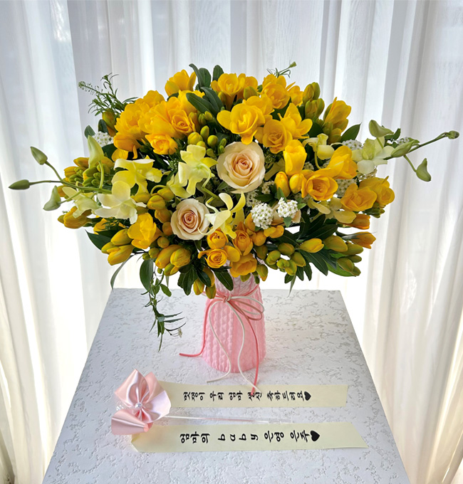 그냥 꽃바구니 아니고 예쁜 화병처럼 와서 더 이쁘네요! 풍성하고 좋아요 번창하세요