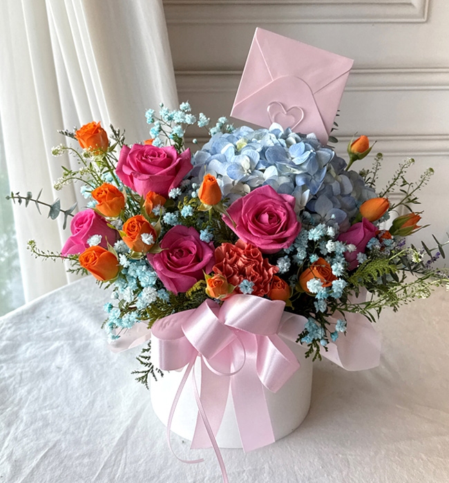 사무실 한가운데 놓인 꽃바구니가 유난히 화사하게 빛나고 있었고, 동료분들도 예쁘다며 한마디씩 건넸다고 합니다. 핑크 장미와 오렌지 톤의 포인트, 그리고 블루 수국의 조화가 정말 세련되고 고급스러웠습니다. 리본과 카드까지 마감이 깔끔해 특별한 날의 의미를 충분히 살려주었습니다.