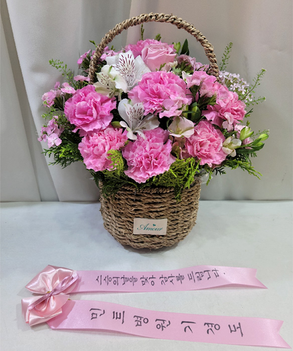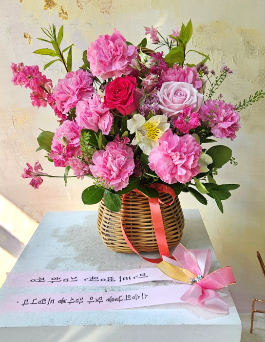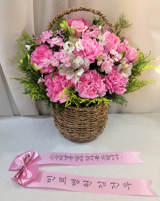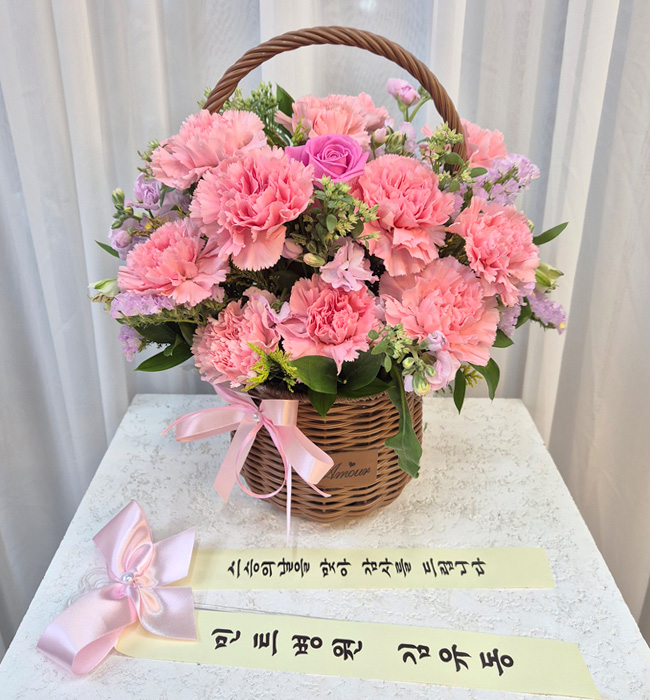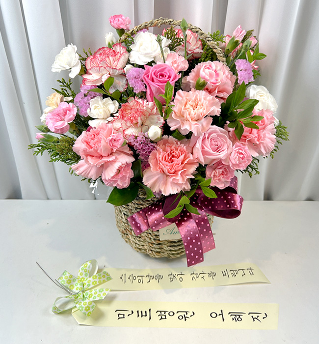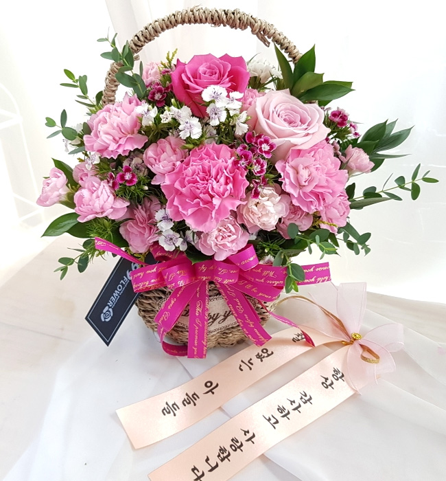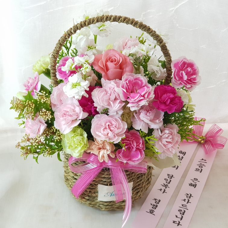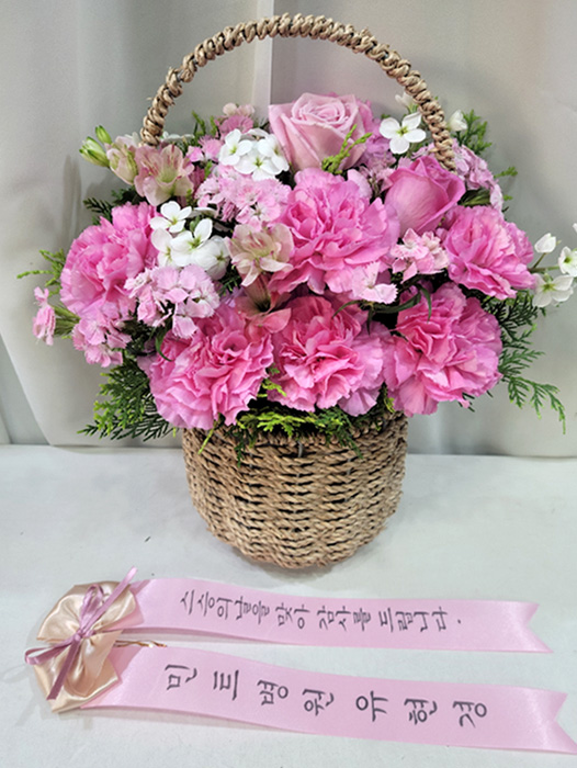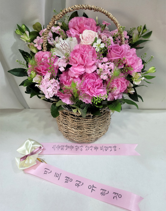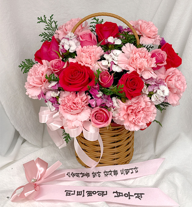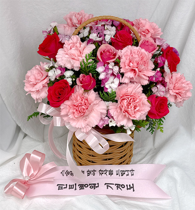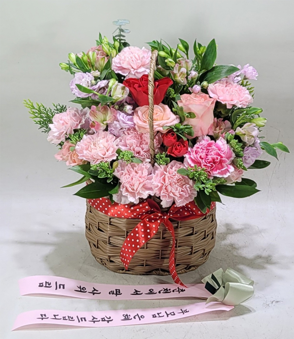 카네이션, 장미, 각종 계절 꽃 및 계절 그린소재, 수제바구니, 리본 또는 카드.