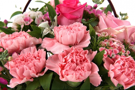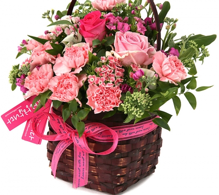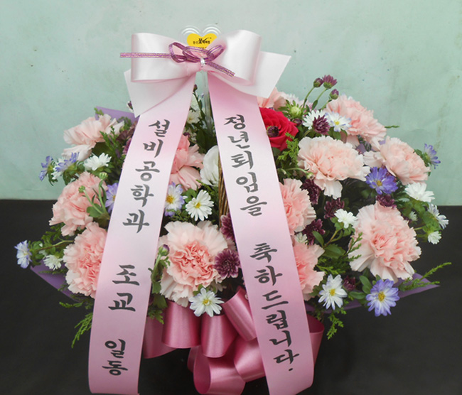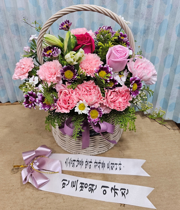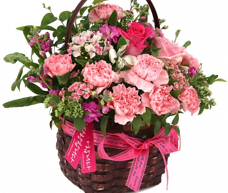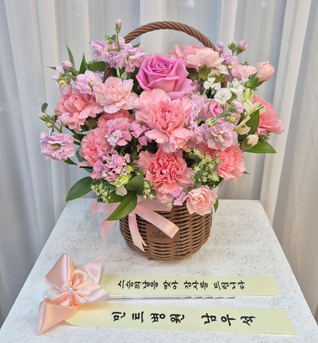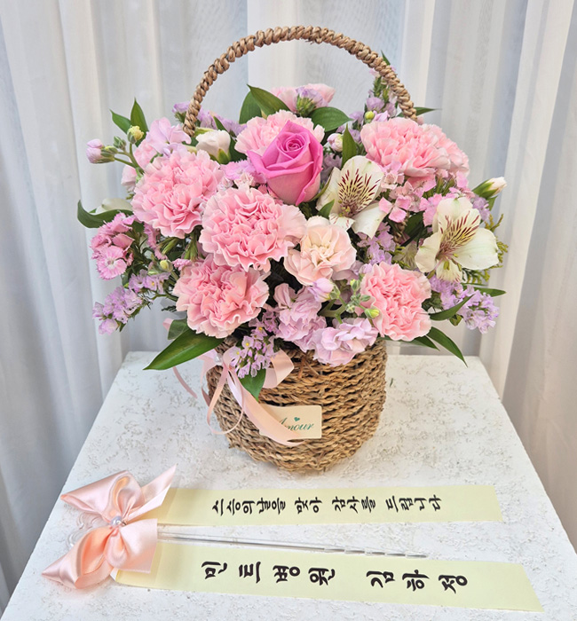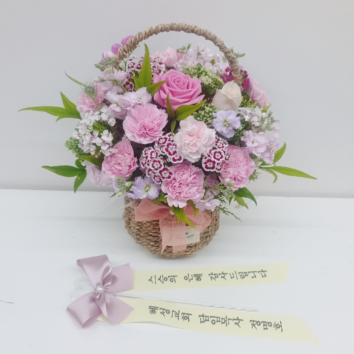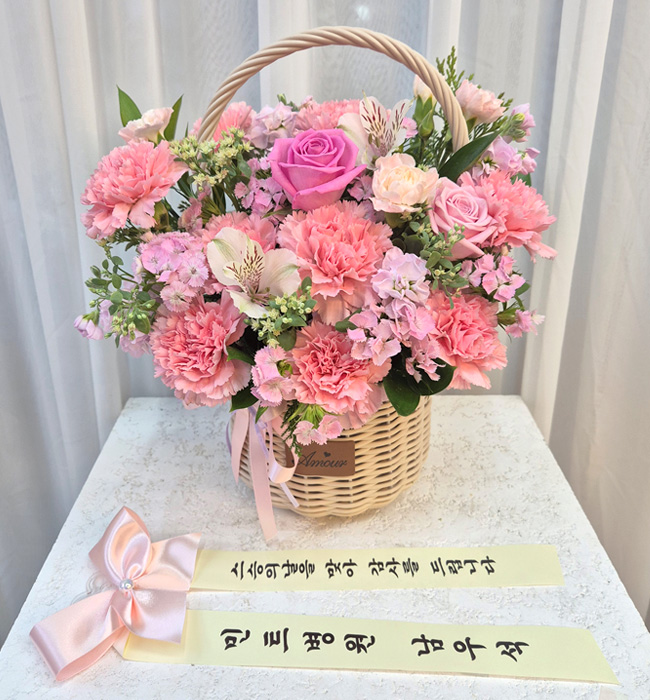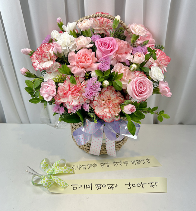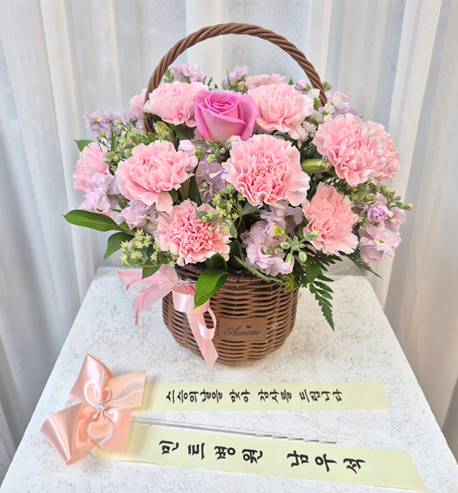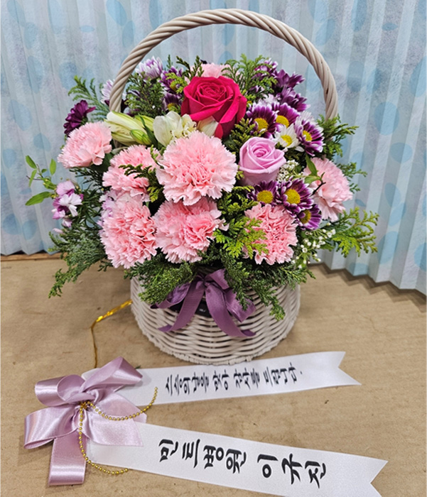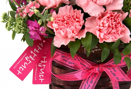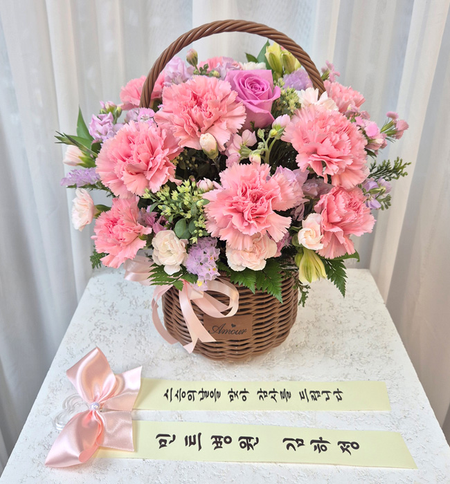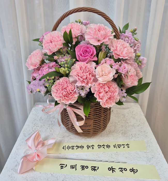 카네이션, 장미, 각종 계절 꽃 및 계절 그린소재, 수제바구니, 리본 또는 카드.